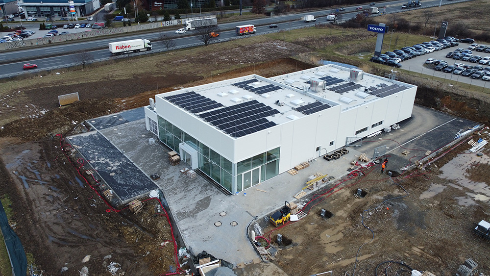 Moderní autosalon Lexus, Praha – Čestlice, FVE na rovnou střechu o výkonu 49,6kWp. Použité technologie: střídač Solaredge, panely PNG 410Wp, Konstrukce k2