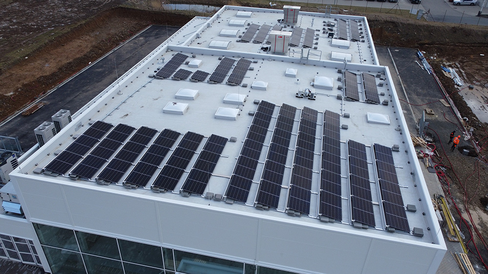 Emado, Hradec Králové, FVE o výkonu 68,08kWp, Rovná střecha skladové haly.