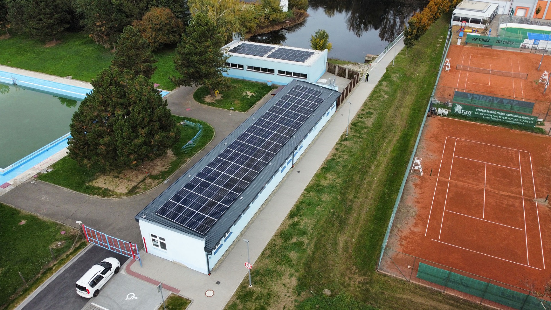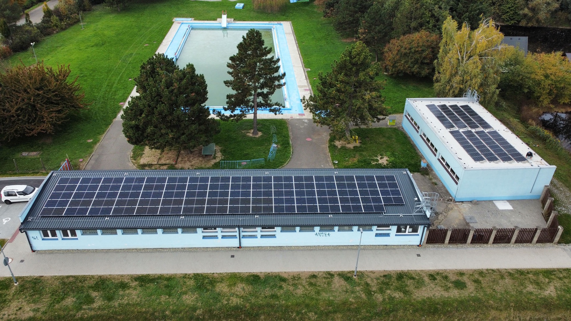Realizace FVE, Koupaliště Širůch, 49,9kWp – Použité technologie – Canadian Solar, panely N-type Bifacial TOPCon 500Wp, hybridní měnič SUNGROW SH10T, baterie SUNGROW SBR128