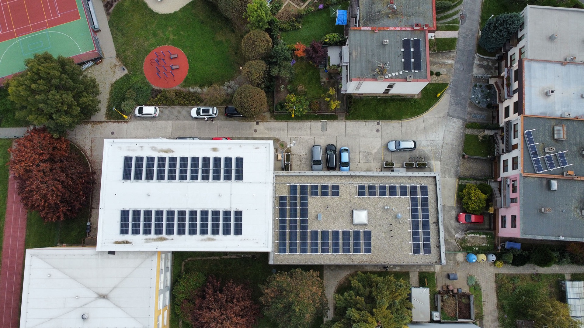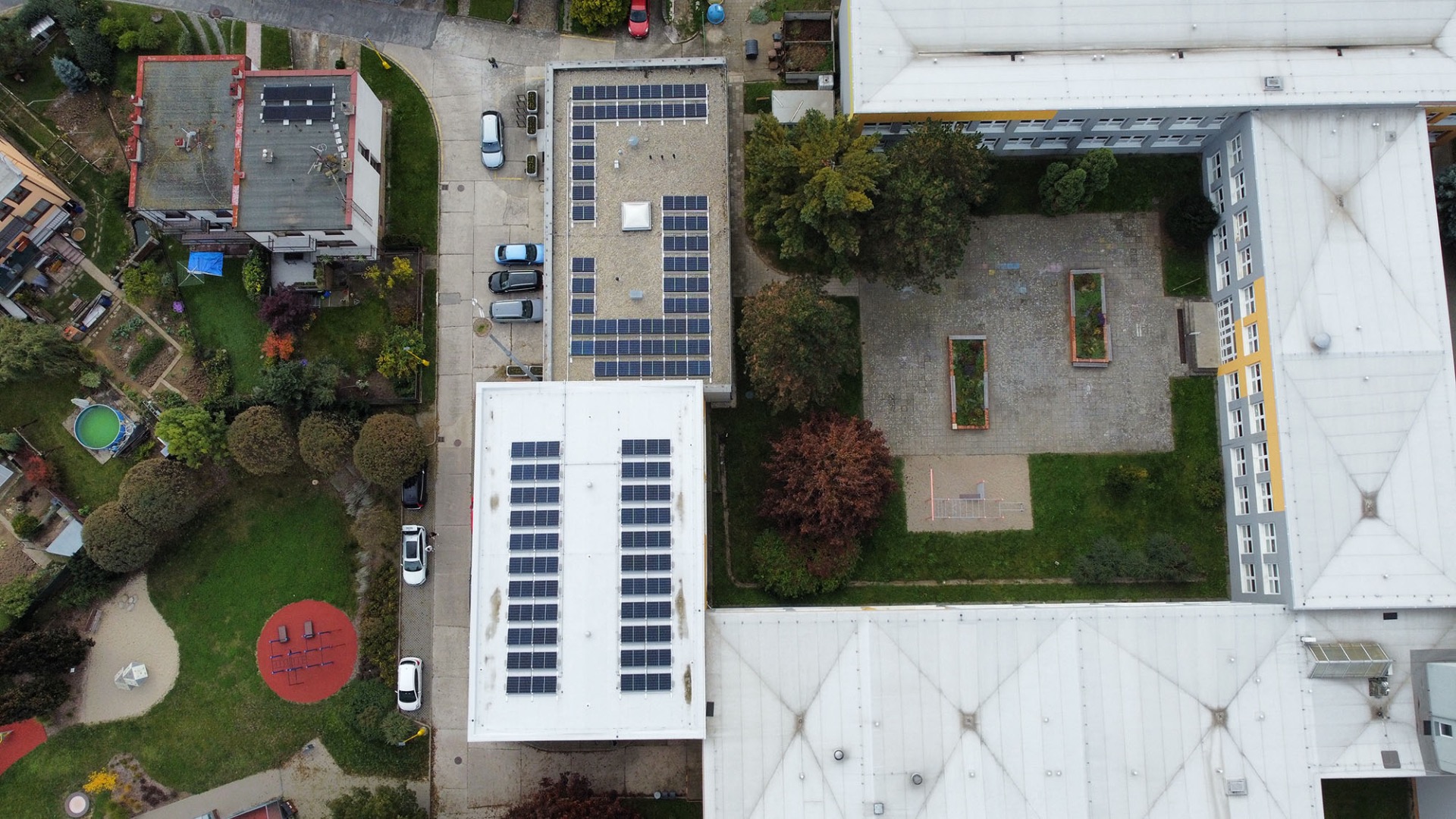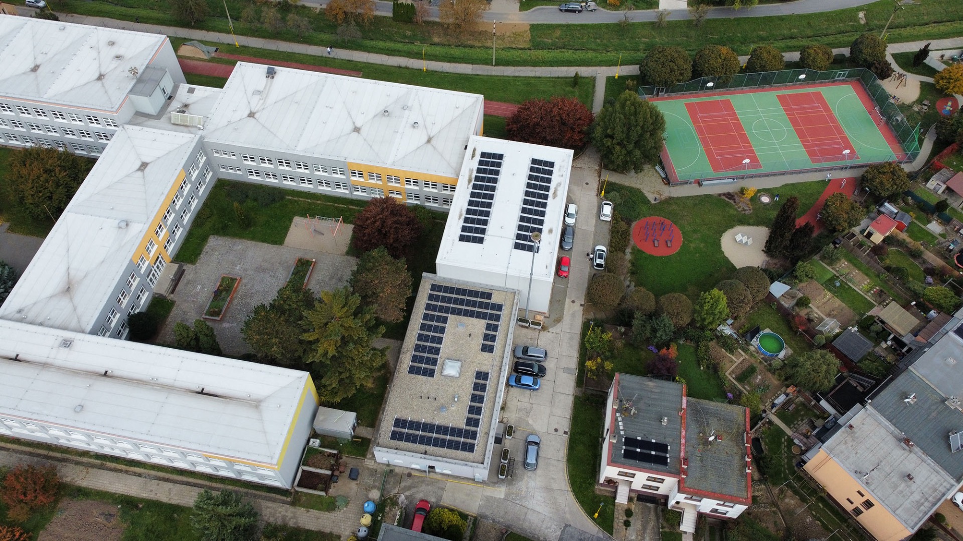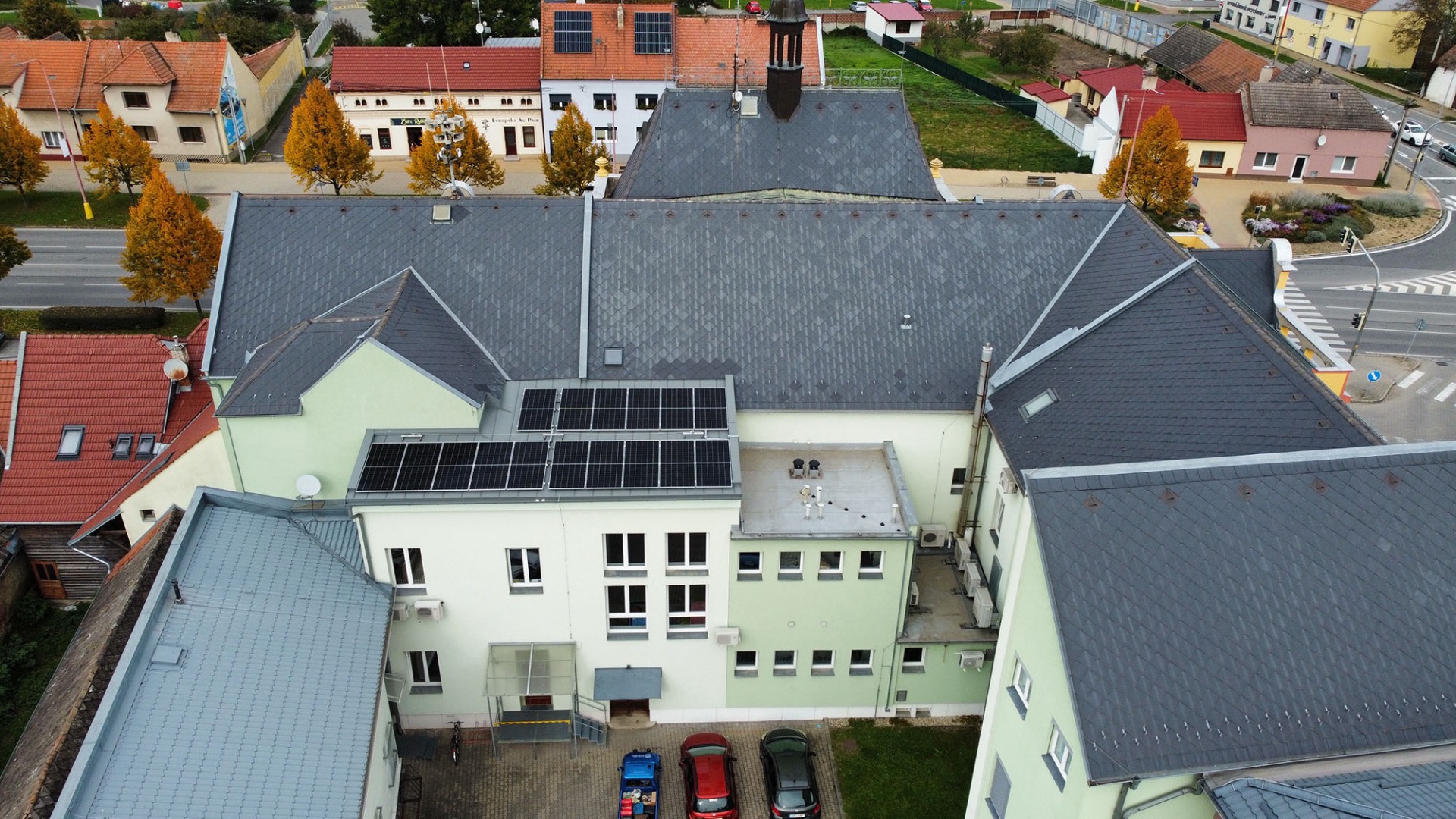 Domov pro Seniory Trutnov, realizace FVE na plochou střechu o výkonu 99kWp, kapacita bateriového úložiště 115,2kWh. Použité technologie: hybridní střídač Deye, baterie Resacs, panely Canadian Solar 455Wp, konstrukce K2.