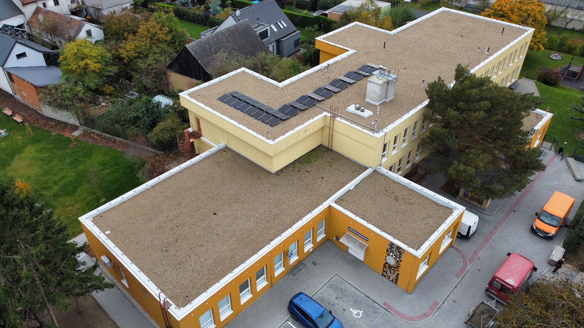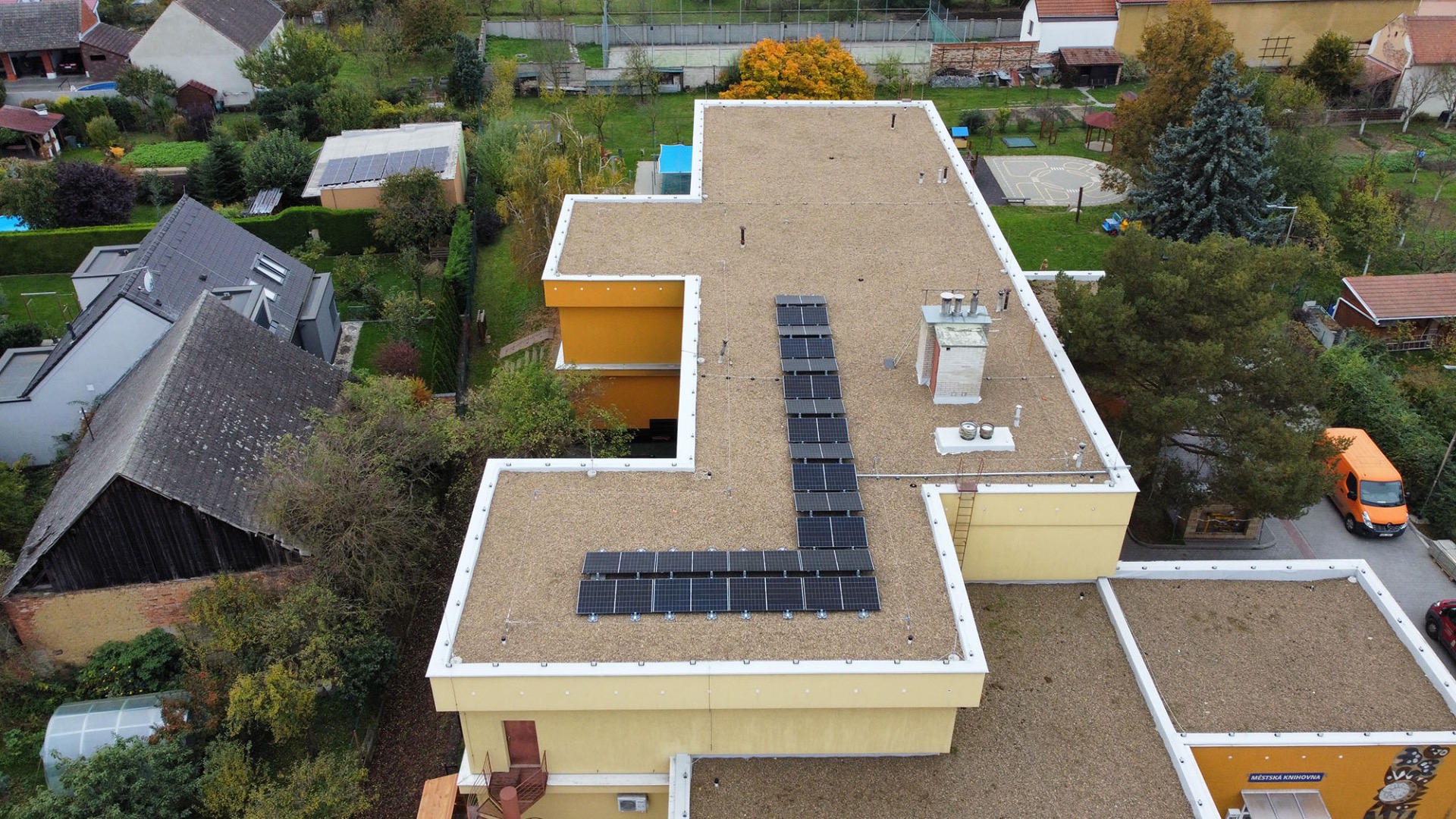 Instalace FVE Ondřejov 25,83 kWp, technologie - střídač SolaX X3-PRO-30K, FVE panely allblack PNG 410W, Optimizery Tigo. Budova přednáškového sálu pro studenty v areálu Astronomického ústavu Akademie věd České republiky (ASU) v Ondřejově.